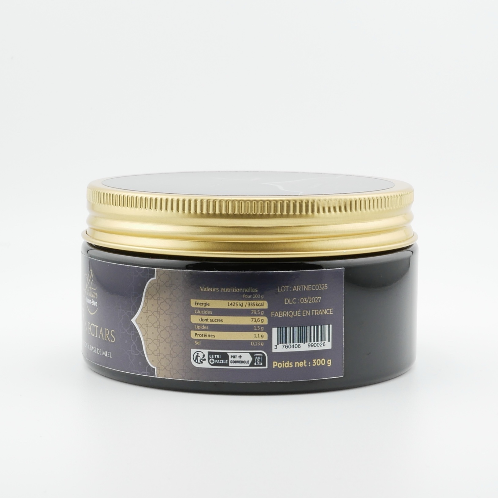 Poids net 300g. Pot en PET, couvercle en aluminium.