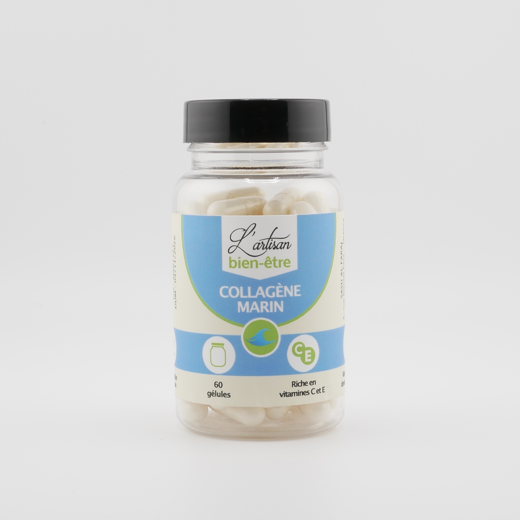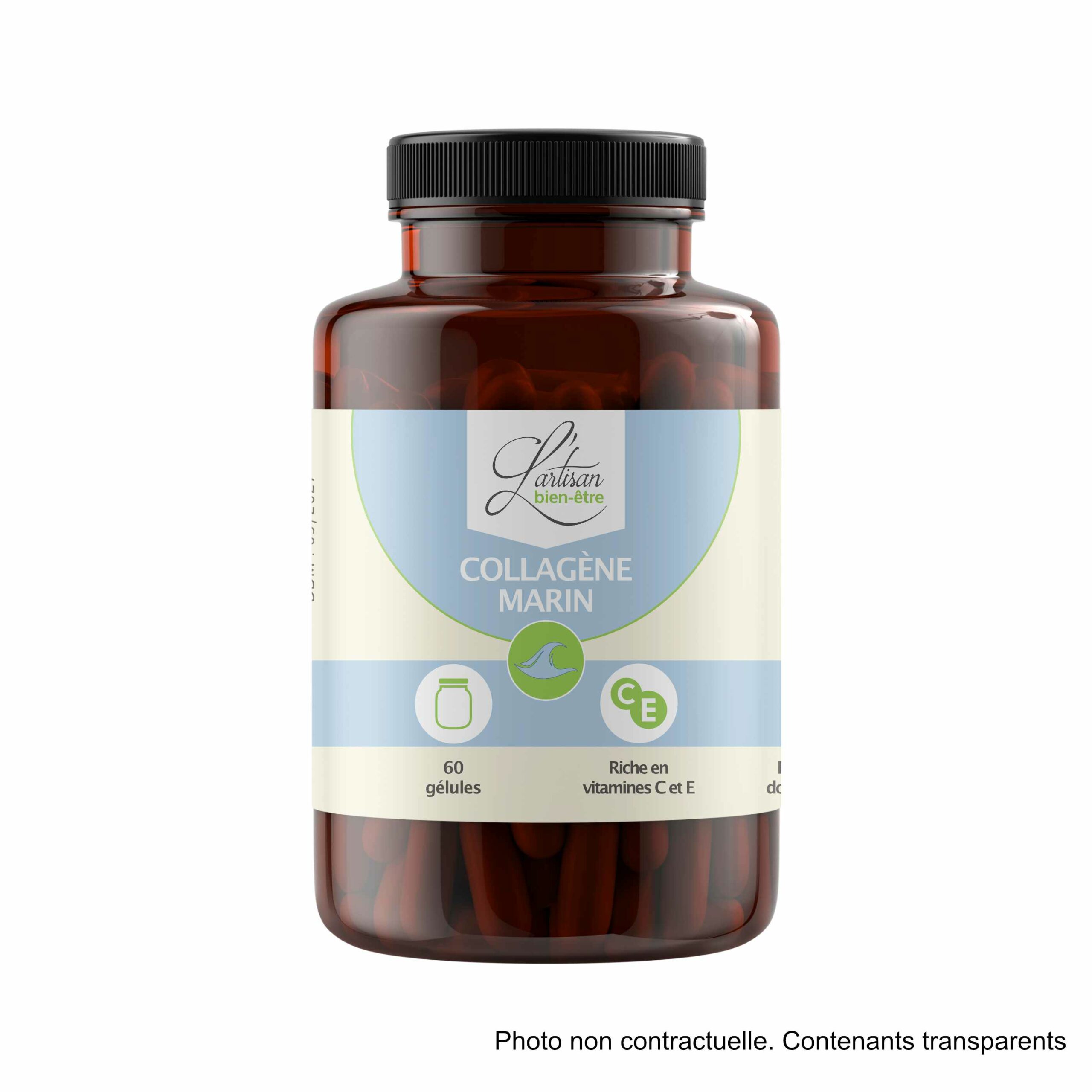 Ingrédients pour 1 gélule : enveloppe HPMC végétale 76 mg, collagène marin (Yunan, RPC) 500 mg. Poids net total : 34,56 g.