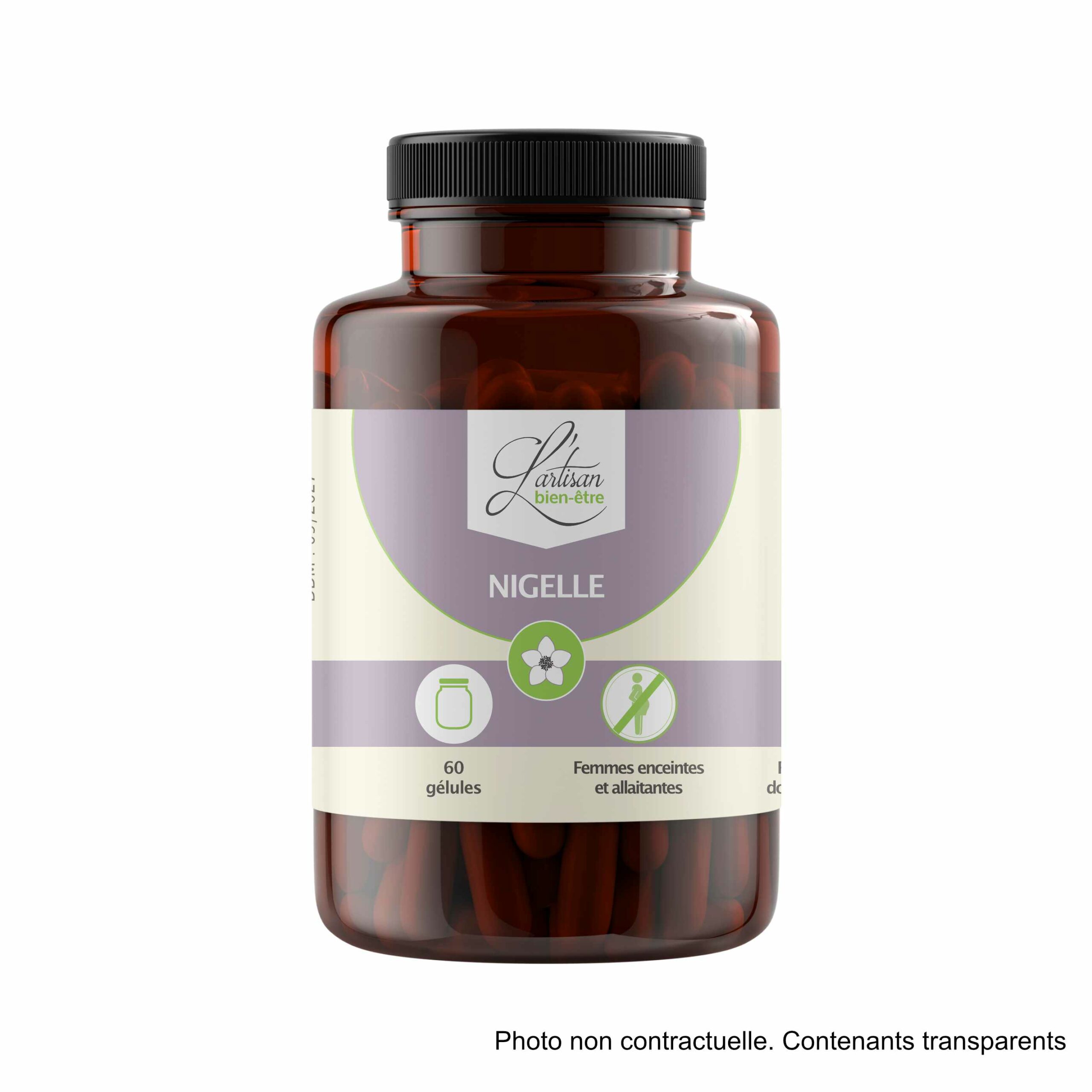 Ingrédients pour 1 gélule : enveloppe HPMC végétale, 500 mg Nigella sativa moulue (Ethiopie).