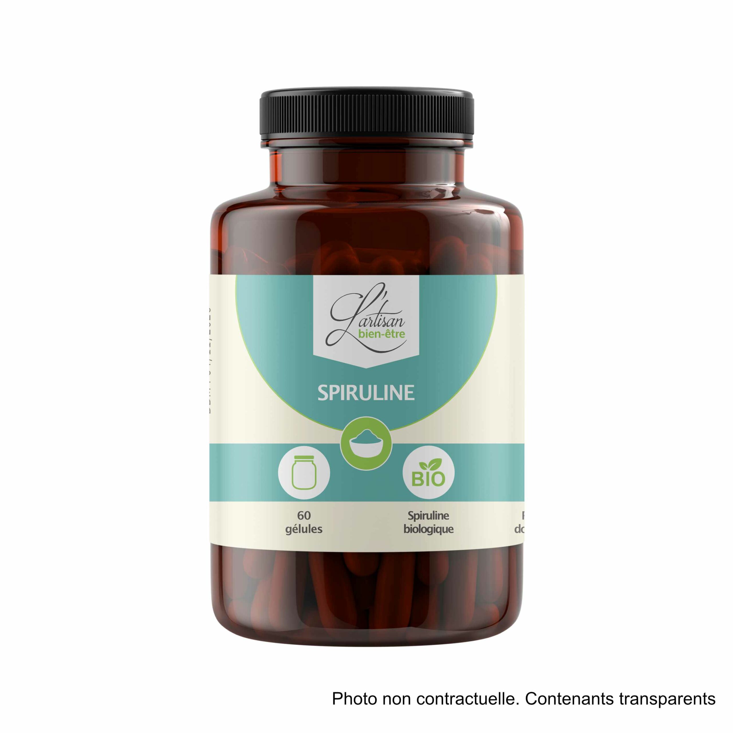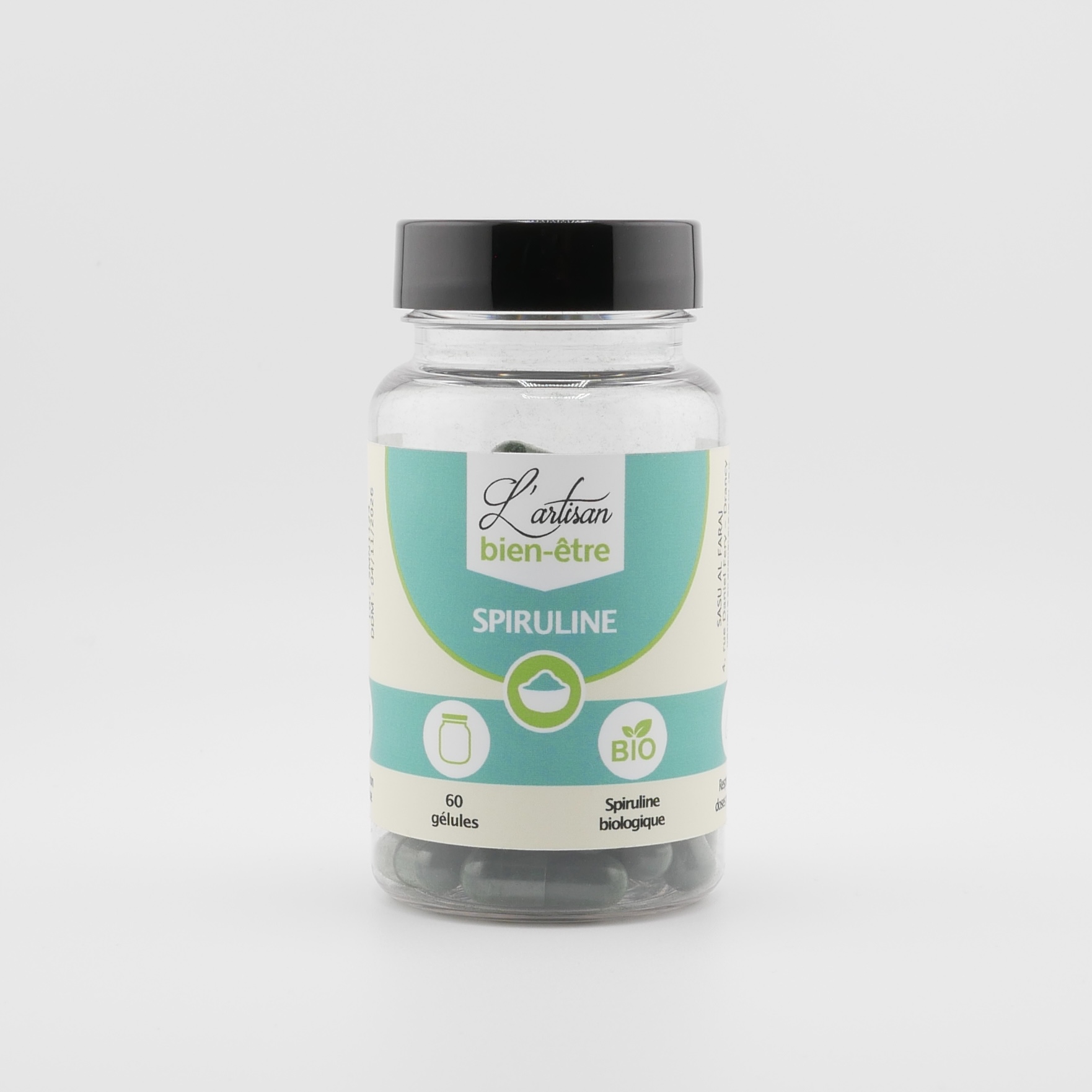 Ingrédients pour 1 gélule : enveloppe HPMC végétale 76 mg, Arthrospira platensis bio moulue (RPC) 500 mg. Poids net total : 34,56 g.